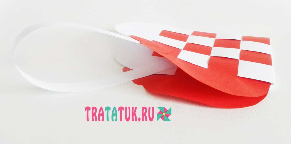 Начинаем плести, в данном случае, красной бумагой. Для этого проводим верхнюю красную полосу вдоль всех белых.