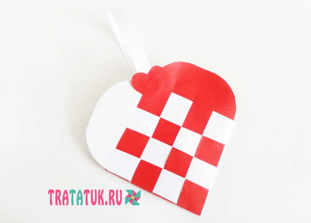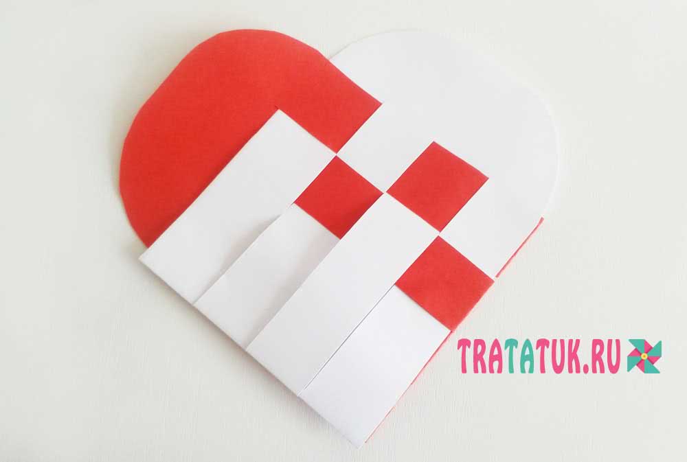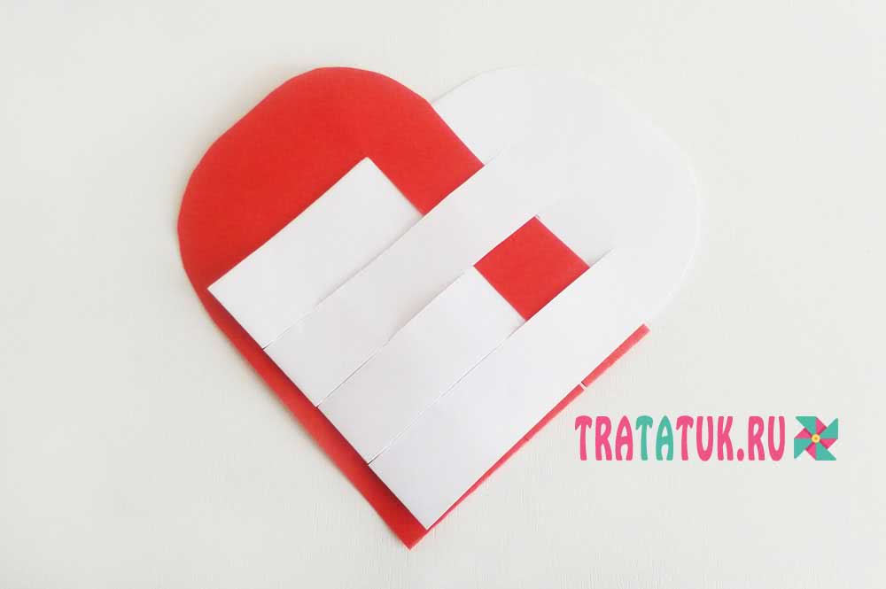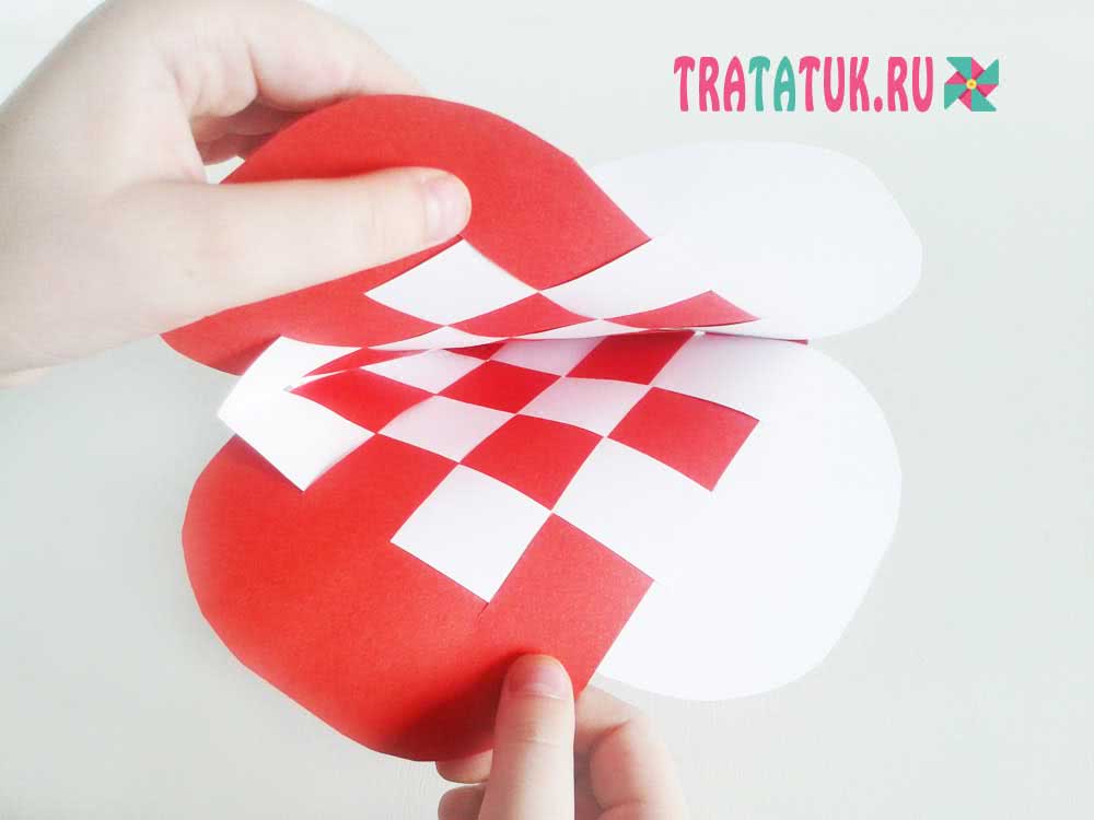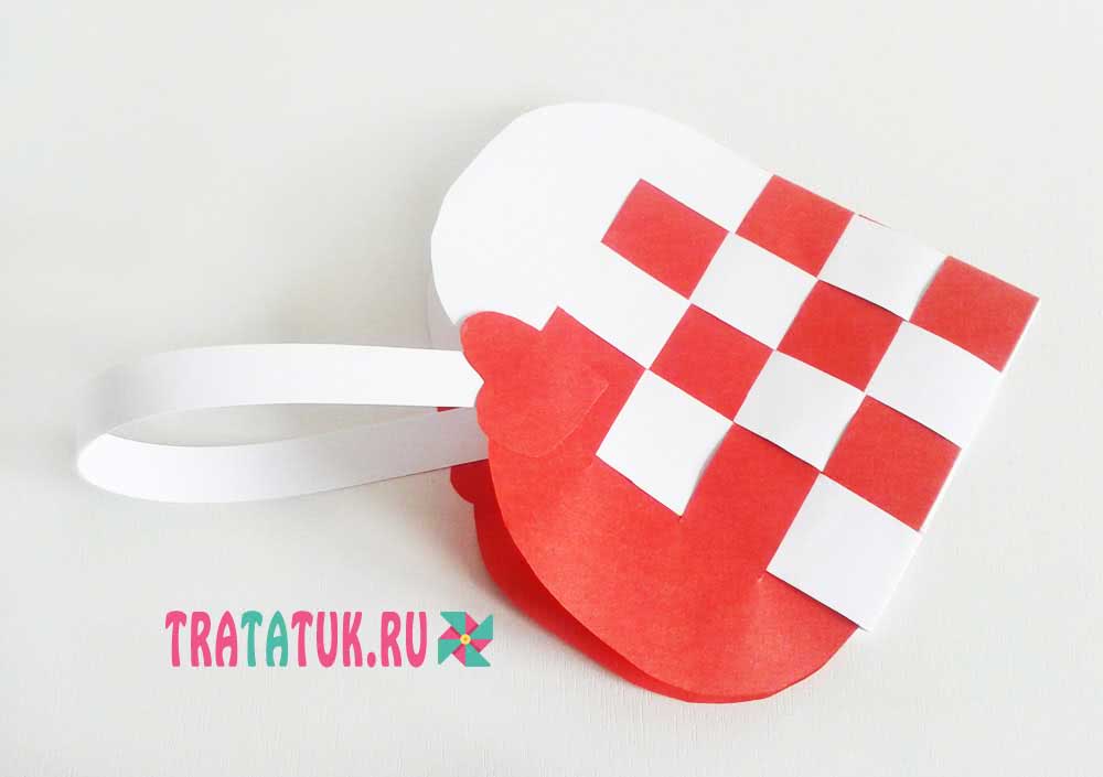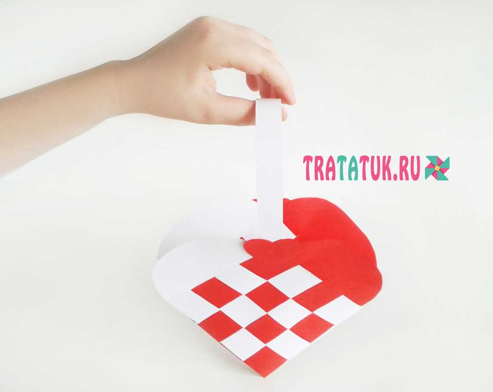 Плетеное сердце из бумаги готово, а так как это еще и сумочка, нужна ручка. Для этого приклейте белую или красную тонкую полосу бумаги, кончиками внутри сумочки. Также можно украсить работу сердечками, разным декором.