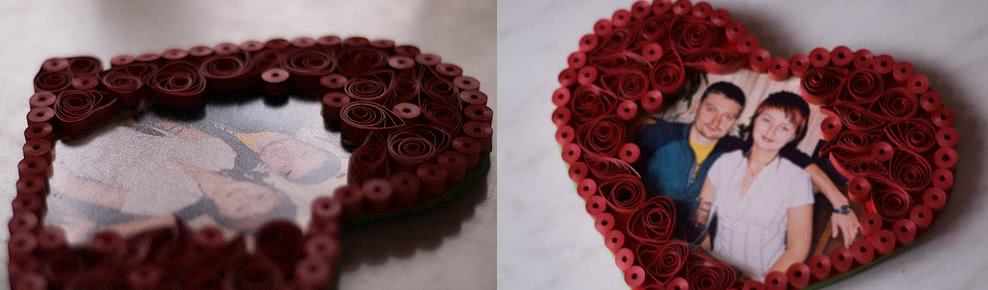 Теперь вам нужно постепенно заполнять сердце внутри и проклеивать, чтобы потом заготовки не выпадали. У вас должна получиться красивая объемная поделка. Если хотите сделать нежную ажурную поделку, используйте тонкие полосочки и миниатюрные роллы.