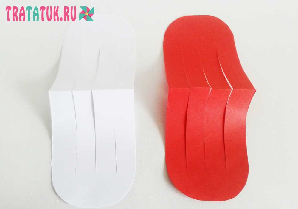 Возвращаем бумагу в исходное состояние, то есть, складываем ее снова вдвое. Разрезаем на 4 одинаковые полосы. На этот раз разрезать нужно в районе сгиба и немного не доводить до кончиков.