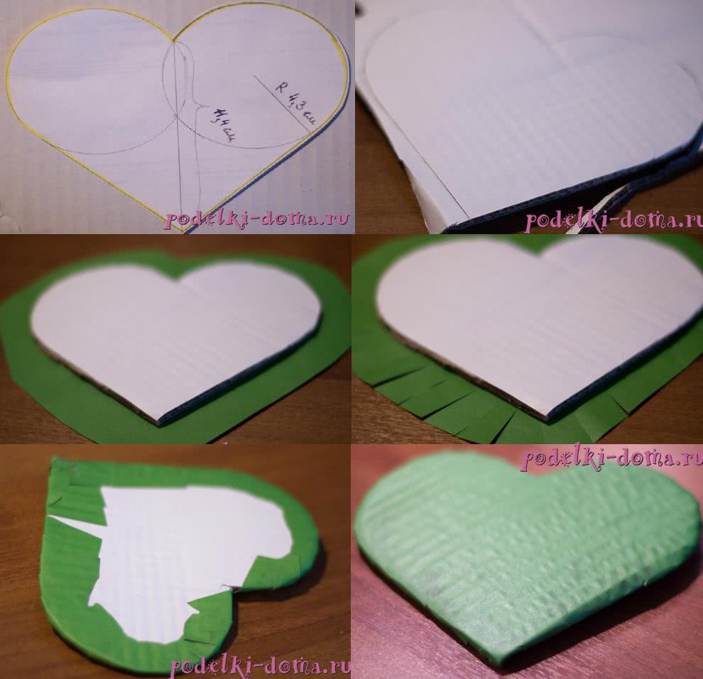 Возьмите готовый шаблон сердца или же сделайте его вручную при помощи циркуля, или чего-то круглого. Затем приложите трафарет к толстому картону, и вырежьте заготовку. Далее приложите заготовку на цветную бумагу и сделайте еще некий запас, как показано на рисунке.