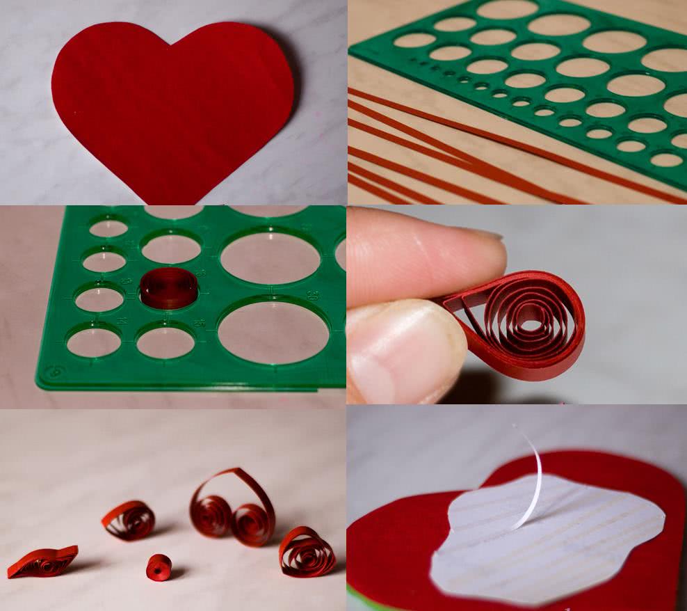 Для тех, кто хочет в короткое время сделать сердечко в технике квиллинг, рукодельницы облегчили задачу. Вы можете взять за основу сердце из цветного картона. После этого разрежьте бумагу на полоски шириной 1-2 см, потом накрутите спиральки с 2-3 витками и наклейте каждую из них на подготовленную ранее основу.