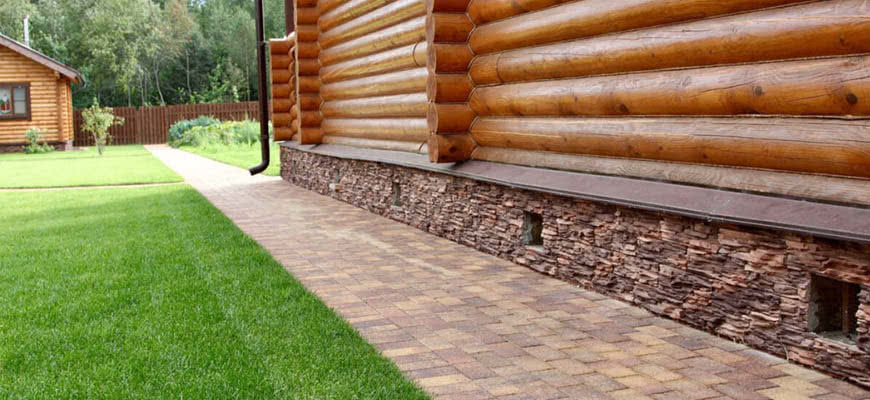 Плитка и брусчатка характеризуются высокой устойчивостью к перепадам температур и влаге. Эти материалы монтируют на предварительно залитое бетонное основание. При формировании защитной «ленты» вокруг фундамента нужно герметизировать швы между плиткой.