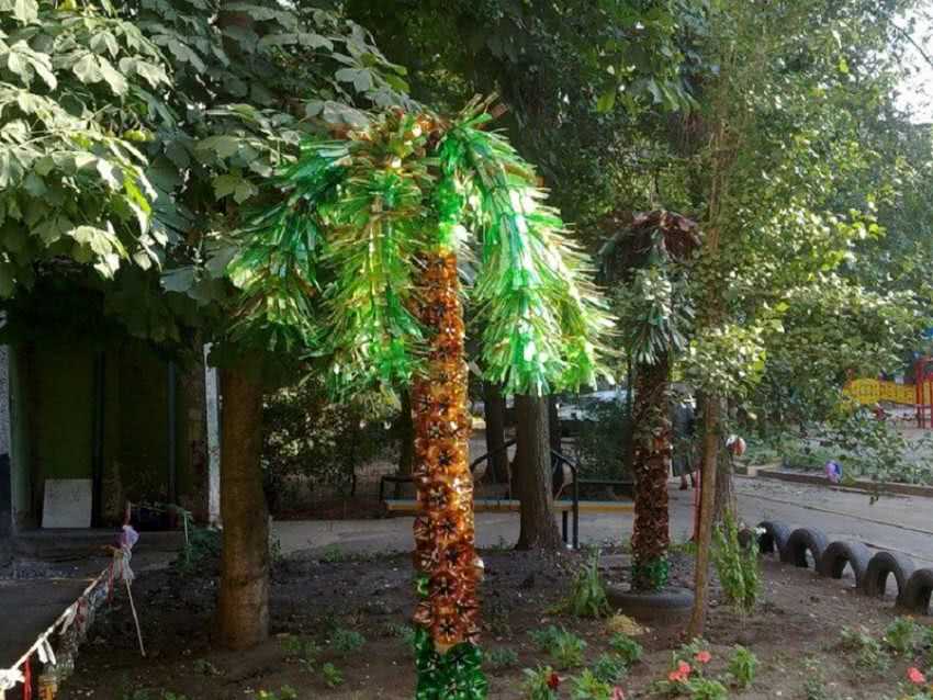 Процесс разложения пластикового материала длится в течение 100 лет. Чтобы не загрязнять окружающую среду, в любом районе налажен вывоз отходов из пластика. Но есть некоторые дачные участки, из которых вывоз отходов не производится. В этом случае добросовестные дачники вывозят бутылки самостоятельно. Чтобы не делать лишнюю работу по вывозу, за один вечер можно изготовить из пластмассовых бутылок пальму. Достаточно собрать на участке всю разноцветную тару. Пальмами можно украсить: