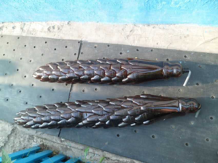 - Когда все заготовки будут готовы, нужно нанизать их на металлические трубки. Для этого тара горлышком вниз усаживается на другую немного со сдвигом для получения красивого бугристого ствола. Принцип нанизывания похож на изготовление шишки. После этого идет закрепление всех частей.