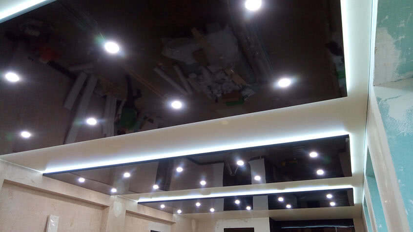 Установка декоративного плёночного полотнища практически не отличается от предыдущего случая, но имеет одну особенность. Так как для крепления ПВХ материал приходится нагревать до температуры почти в 80оС, то ленту подсветки нужно будет укладывать по окончанию монтажных работ, в том числе обустройства дополнительных ярусов из гипсокартона.