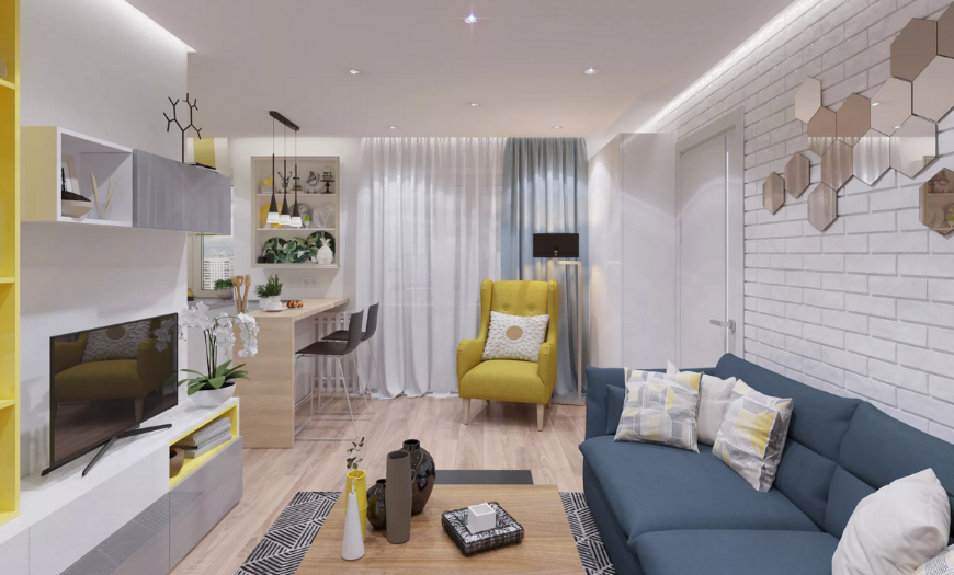 Классика – сочетание белого и насыщенного синего. Такой дуэт придает помещению роскошности, легкости, свежести. Неординарным личностям подойдет союз синего с солнечным желтым, который задает позитивное настроение. Комбинация с красным возможна, но смотрится экстравагантно.