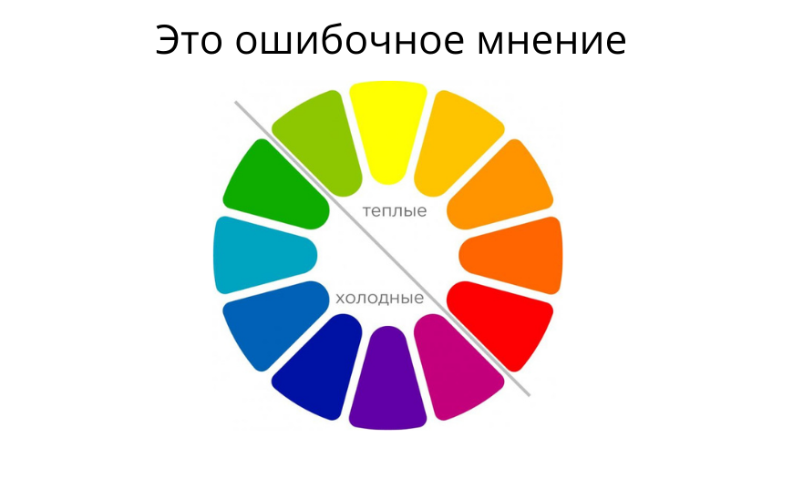 На многих сайтах есть такая версия распределения цветов на теплый и холодный (фото ниже) — это является грубой ошибкой: например, красный цвет может быть не только теплым, но и холодным, то же касается и других цветов, кроме оранжевого.