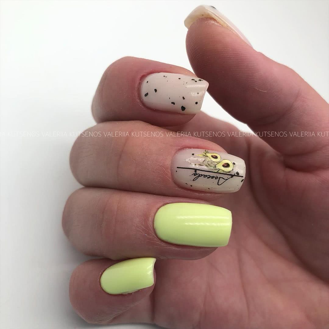 С данным необычным и современным цветом можно «играться» дополняя его всевозможным колоритным дизайном, стразами, цветной пыльцой и фольгой. Nail мастера предлагают нам взять за основу комплементарный желтый пастельный цвет лака и дополнить его нейтральным молочным или же бежевым оттенком.
