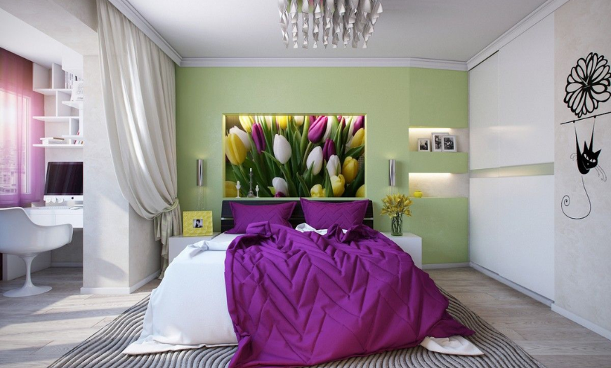 Пастельно-салатовый и темно-серый выглядят красиво и контрастно и разделяют спальную и рабочую зоны