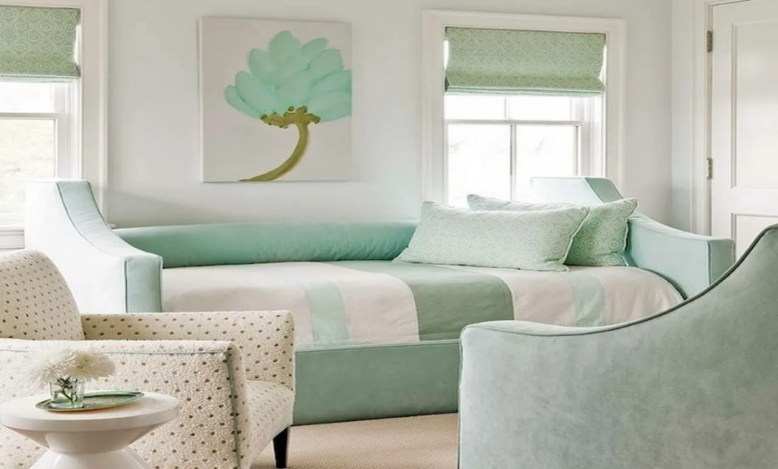 Мятный тон – идеальное решение, если хотите создать воздушный дизайн в квартире, который способствует расслаблению и отдыху. Палитра универсальная, гармонирует со многими оттенками.