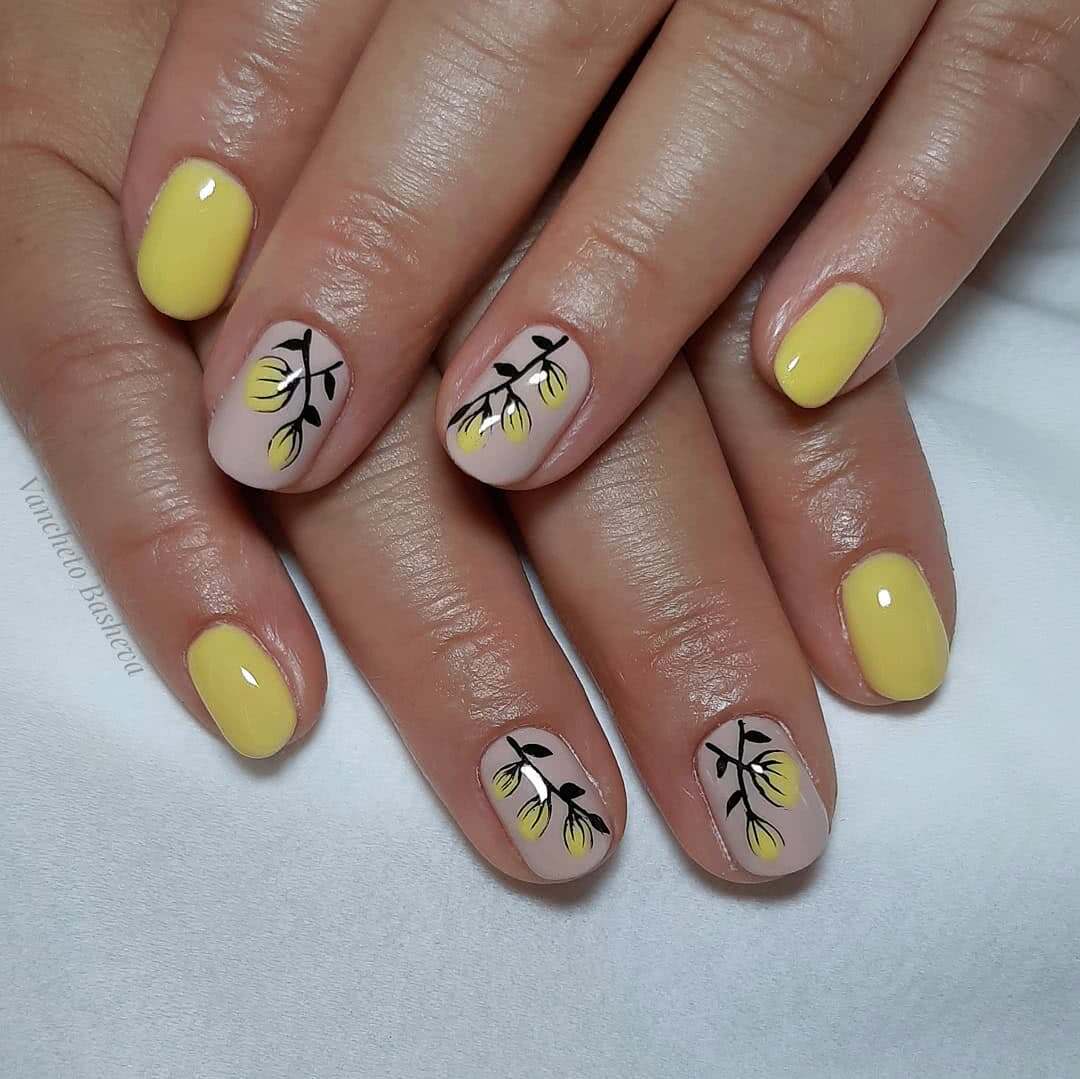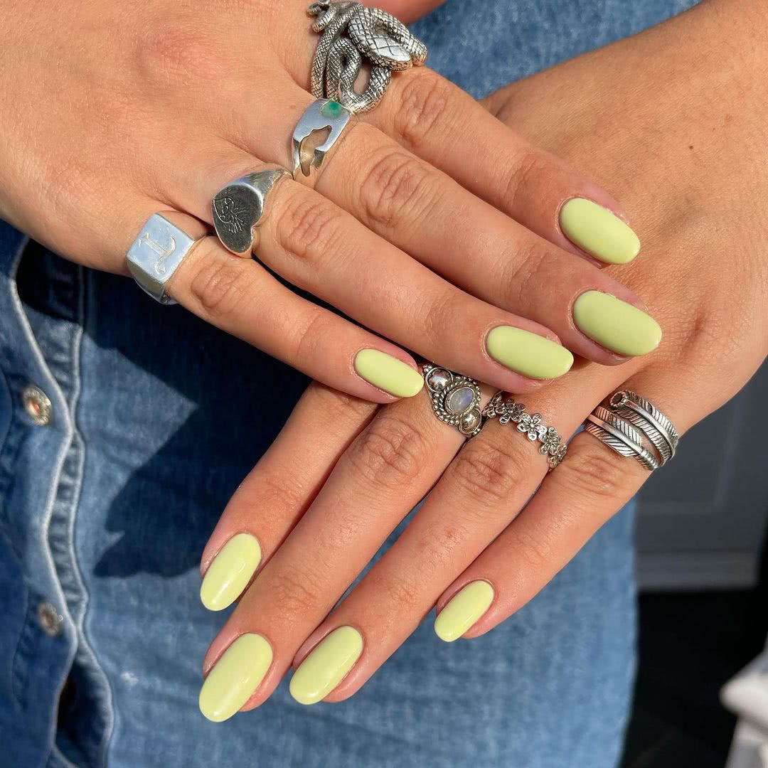 В 2021 года особую актуальность имеет именно припыленный желтый цвет в маникюре.