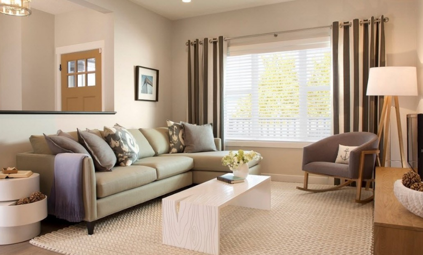 - Гостиные комнаты, облаченные в эту цветовую гамму, могут быть выполнены в самых разных дизайнерских стилях. Светлые тона при любых раскладах смотрятся замечательно, работая с ними очень сложно допустить непоправимую ошибку. При этом светлые пастельные тона будут освежать помещение, добавлять в него нотки спокойствия, гармонировать с белыми элементами. В этом случае акцент на необходимую зону сделать крайне просто, всего лишь покрасив ее в более насыщенный цвет. Заканчивая полноценную картину, подбирается мебель, причем особых ограничений в ее цвете нет.