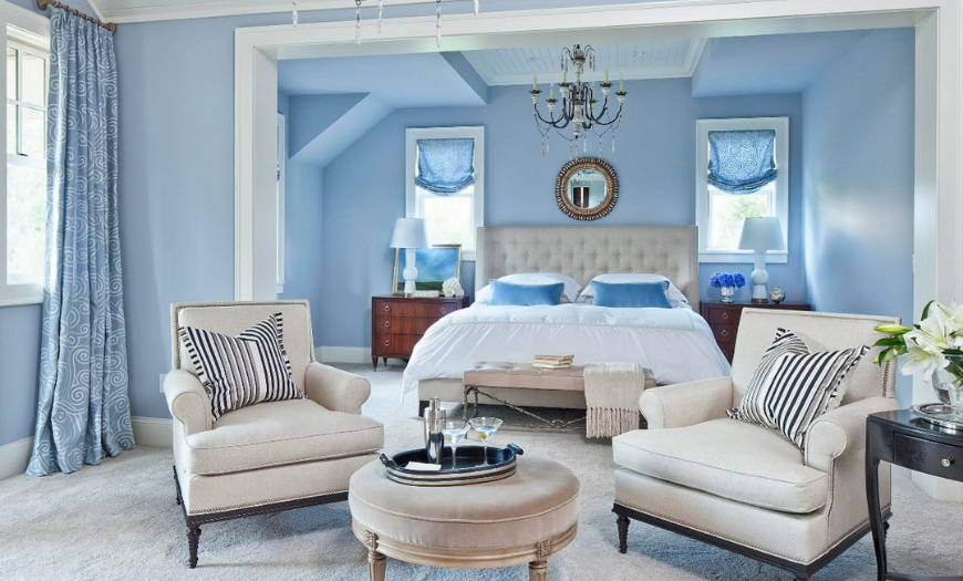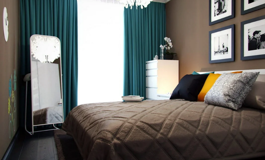 Светлая спальня в голубых тонах с яркими акцентами в виде штор и других атрибутов интерьера