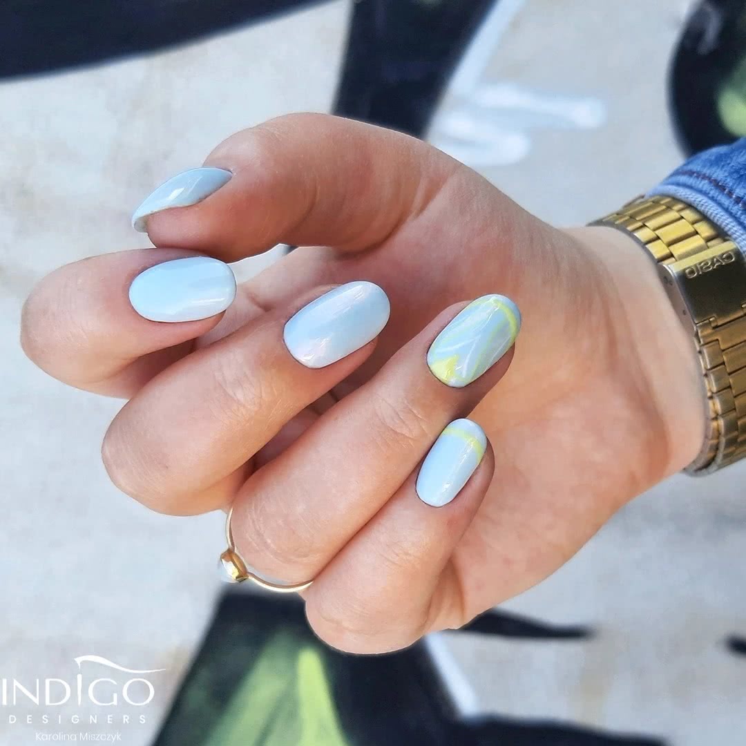 Пастельная палитра лаков — это не скучные однообразные цвета, она также может быть многогранной и разноцветной. Если говорить про летний маникюр 2021 года, но тут чаще всего мелькают приглушенные голубые, желтые, лиловые, розовые, а также зеленые оттенки.