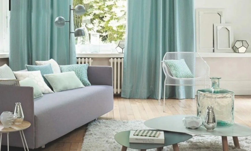 Холодными принято считать светлый ультрамарин, бирюзу, голубой, жемчужный, оттенки серого. Палитра хороша для больших комнат в южной части дома. Например, модный мятный оттенок в аксессуарах, обивке мебели, шторах гармонирует со стенами слоновой кости. Другие варианты декора можно подобрать по фото.