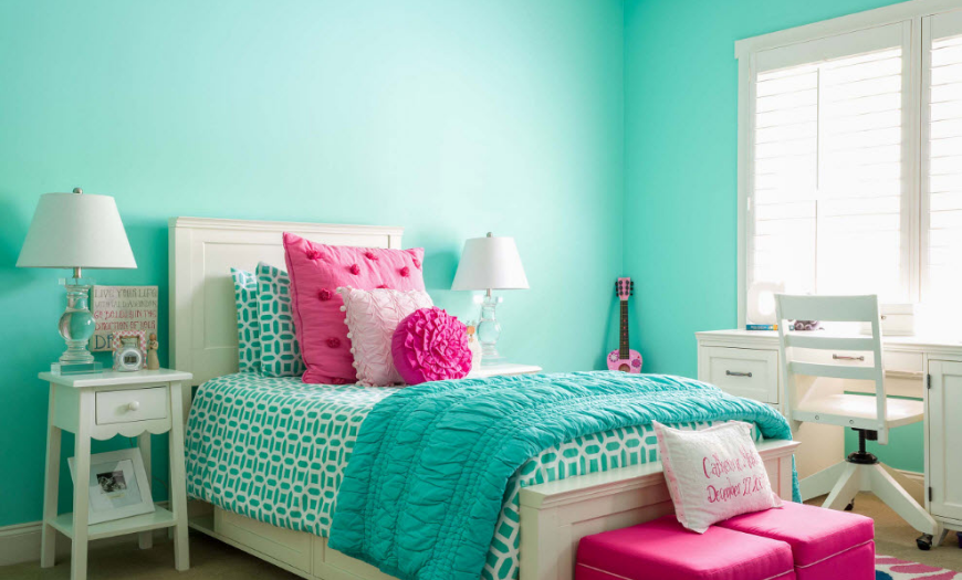 - Модный тренд для девчачьей спальни — цвет фуксии, преходящий в темно- серый и розовый, нежно-сиреневый градиент, перетекающий в розовый и белый.