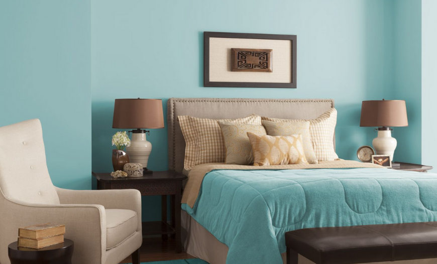 Если не знаете, в какой цвет покрасить стены в спальне, то светлые песочные оттенки будут очень уместны. В сочетании с белым и кремовым они сделают светлей северные комнаты, коричневые шоколадные тона добавят сдержанности.