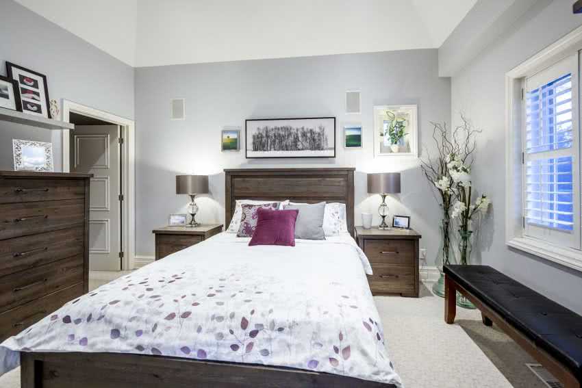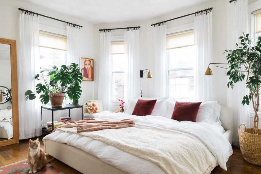 Красивыми и удобными элементами декора служат красивые бра и торшеры, ковер, декоративные полки для книг и украшений. В просторной спальне можно разместить большое живое растение в напольном керамическом горшке.