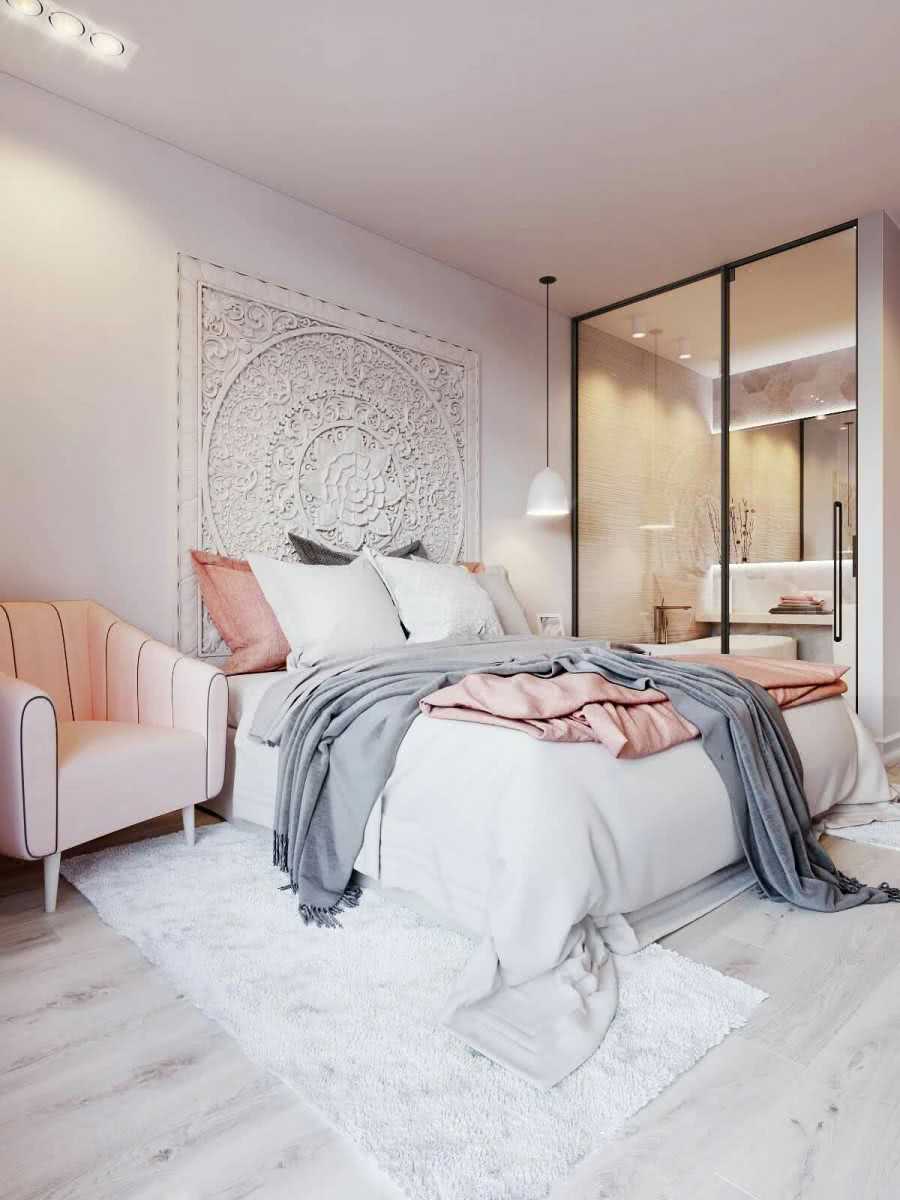Пастельные тона создают камерную атмосферу и подчеркивают контрасты, созданные декоративными элементами