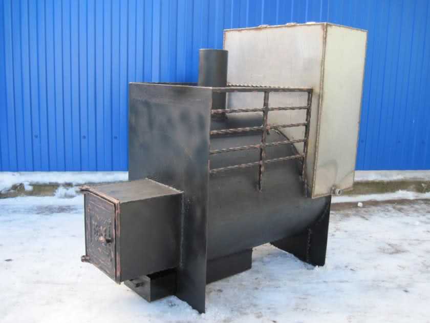 Основные части печки – топка и бак с водой. Поддувало должно быть с шириной 20 см. В баке с водой – отверстие под дымовую трубу.