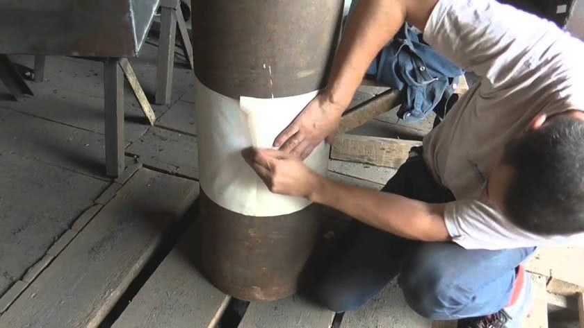 Отрезают трубу по размеру будущей печи и ставят ее на ножки. В верхней части цилиндра приваривают две пластины в виде конуса. Труды сгибают под углом 45 о и приваривают к верхней части корпуса. В шахматном порядке закрепляют куски металла. Конструкцию помещают в корпус и заваривают. Выпиливают отверстия для дымохода и дверей печи. Монтируют петли, заглушки и двери.