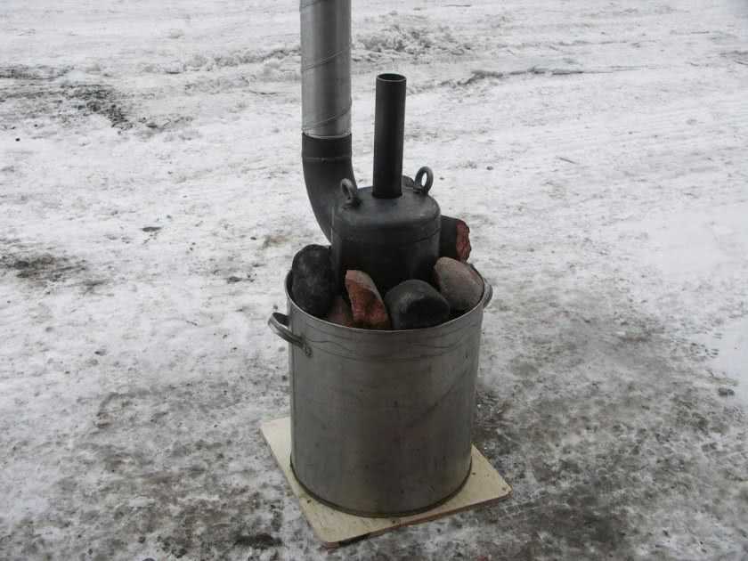 Остальные детали — дверцы, петли к ним, задвижки, кран для бака с водой, решетки для зольника и каменки рекомендуется купить в специализированных строительных магазинах. Дымоход изготавливается из кусков трубы подходящего диаметра (не менее 10 см), ножки — из металлических обрезков достаточной толщины, чтобы выдержать вес печи, а также сетки с камнями. Для наполнения каменки подойдут речные валуны округлой формы и подходящего размера.