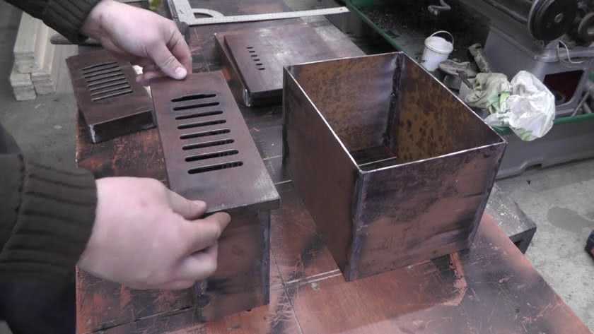 - Свариваются боковые стенки, днище корпуса. В лицевой части вырезаются отверстия для топочной камеры и зольника. Внутри к стенкам корпуса привариваются металлические уголки для крепления отсеков.