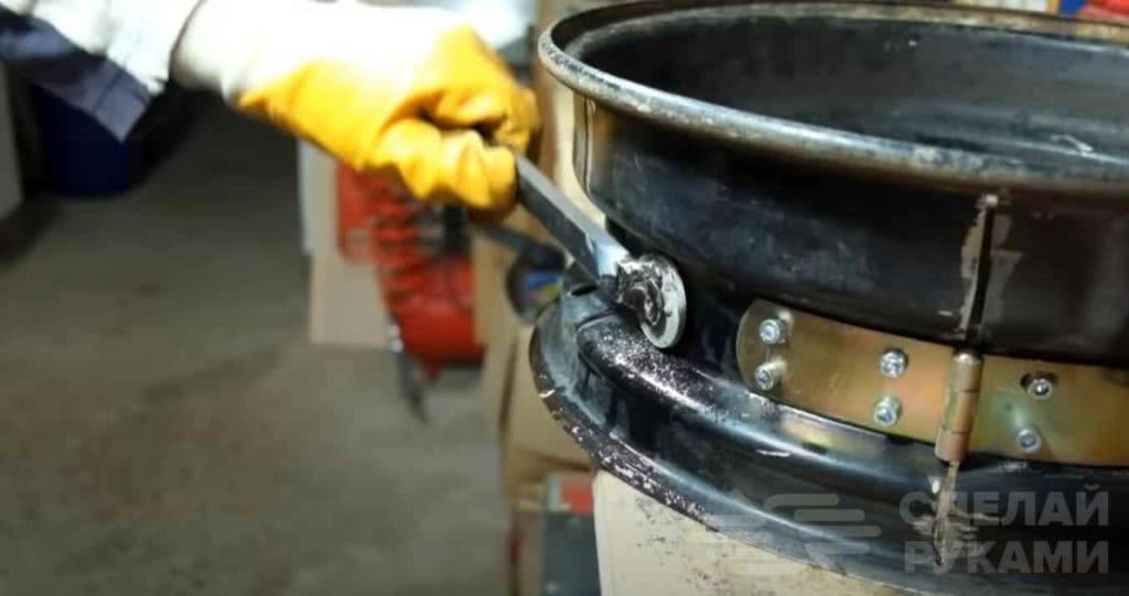 - Теперь нам нужно сделать дверцу. Для вашей печки она не помешает, с ее помощью вам будет легче поддерживать огонь. Вы в любой момент можете подкладывать новые порции топлива, не снимая блюдо с мангала. Но чтобы всё сделать максимально аккуратно, сперва вам следует наметить границы дверцы, нанеся их на боковую поверхность колесной печи. Рекомендуется располагать дверцу на 2–3 см выше дна. Примерно по центру прямоугольника, которым вы изобразили дверцу, будет проходить сварной шов. После нанесения разметки начинаем вырезать отверстие для дверцы, а по завершении этой операции необходимо зашлифовать края выреза. Далее, берем болты и на одной из боковых сторон прямоугольника сооружаем петли, чтобы дверца могла легко открываться. К дверце привариваем гайки, с помощью которых можно будет навесить ее на болты, которые предварительно нужно установить на корпусе. В завершение этого этапа необходимо изготовить ручку для дверцы. Для нее нам потребуется дополнительный болт. Его нужно приварить в паре сантиметров от края на стороне, противоположной от петель.