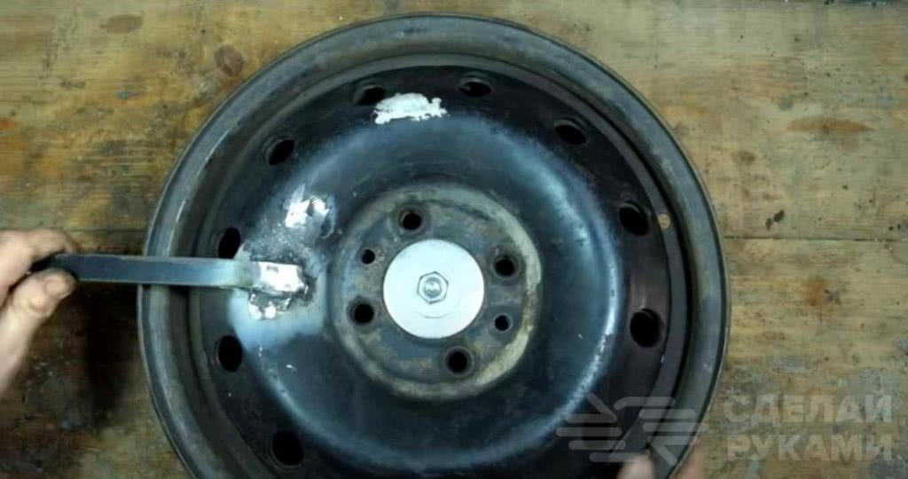 Стоит отметить, что конструкция из алюминиевых колес не подойдет, нужно брать стальные диски в количестве двух штук.