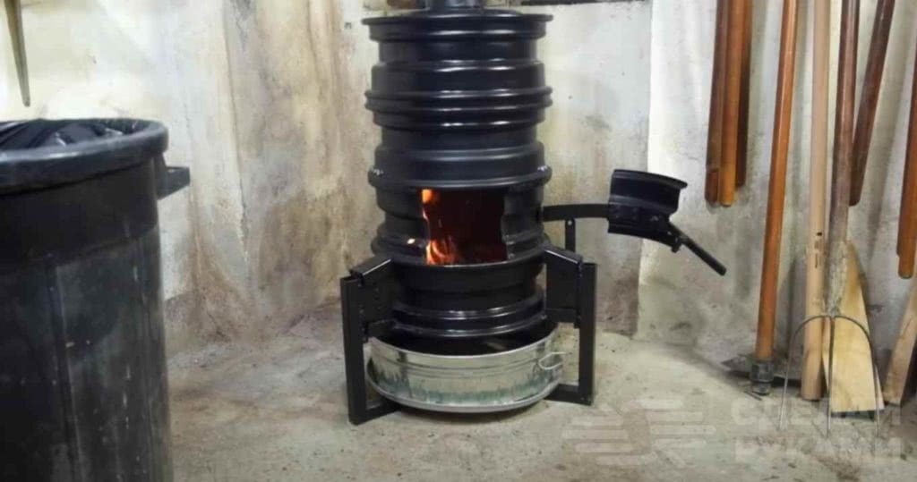 Буржуйка из колёсных дисков будет переносной, что очень удобно, так как использовать такую конструкцию можно по мере необходимости в не только в гараже, но и в других помещениях. Она может устанавливаться как в горизонтальном, так и в вертикальном положении. Обе модели обладают высокой теплоотдачей, а отличаются друг от друга только наличием колосников и расположением дымоотводной трубы.