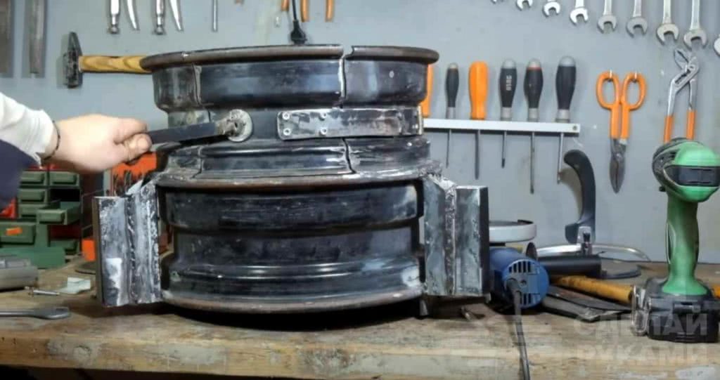 Для создания последней, верхней части печи нужна пара автомобильных дисков. Этот отсек предназначен для нагрева воды.