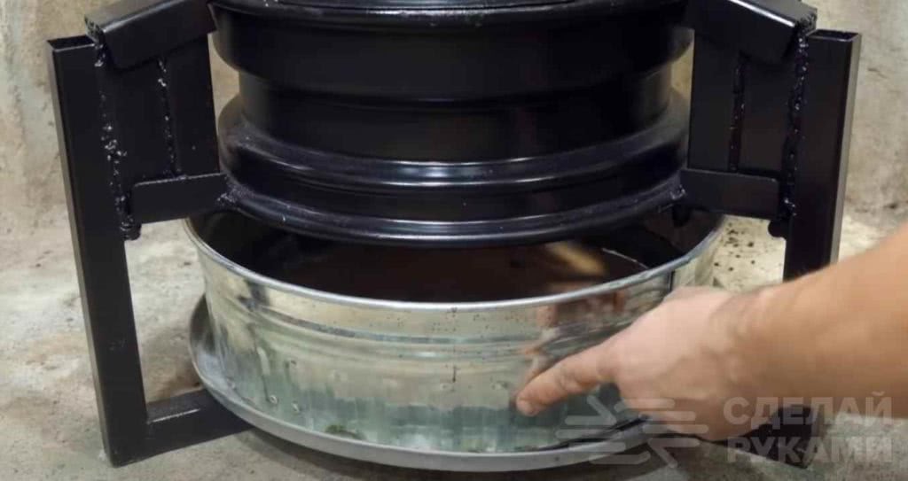 стенки двух дисков сварить между собой. Дно нижнего диска закрыть металлической пластиной и приварить к ней ножки из металлического уголка или арматуры;