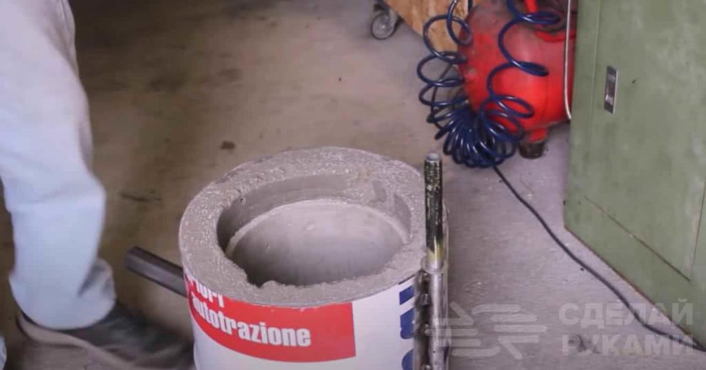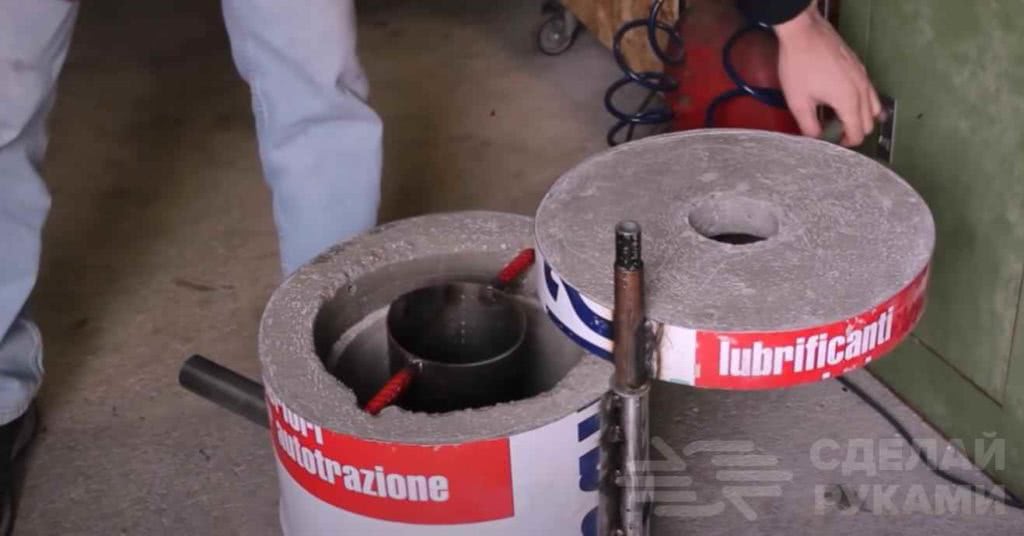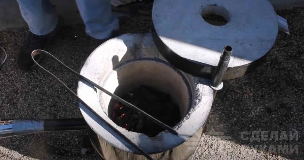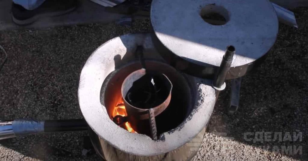 Из кирпичей сооружается очаг, каркас изготавливается из металлической емкости. Сбоку сверлится отверстие для подачи кислорода. К металлической трубке присоединяется пылесос, фен или другой прибор, нагнетающий воздух. После разведения огня тигель помещают в очаг.