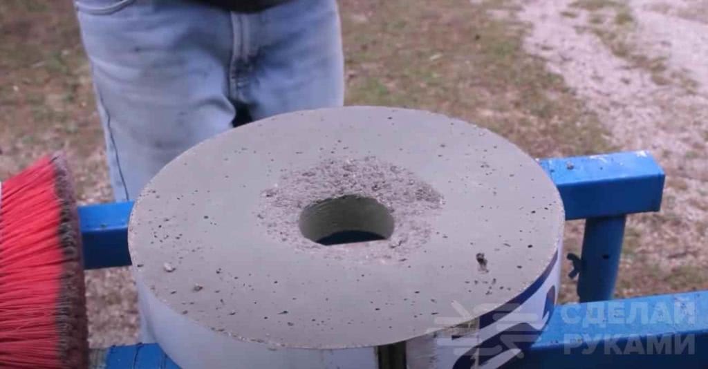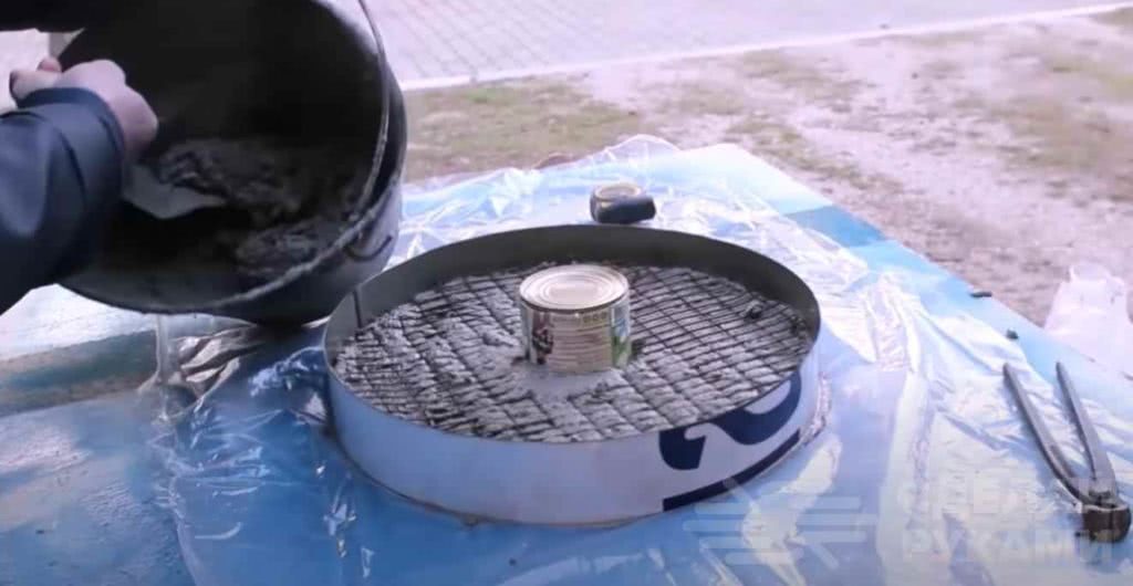 На следующем этапе автор приступил к изготовлению крышки печи. В качестве готовой формы используется кольцо от бочки. Заполняем его раствором и армируем сеткой.