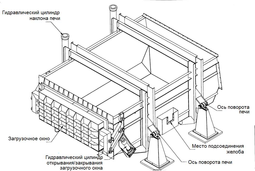 Наклоняемая печь требует более значительных капитальных влолжений, так как для того, чтобы вылить расплав ее наклоняют с помощью гидравлических цилиндров (рисунок 2).