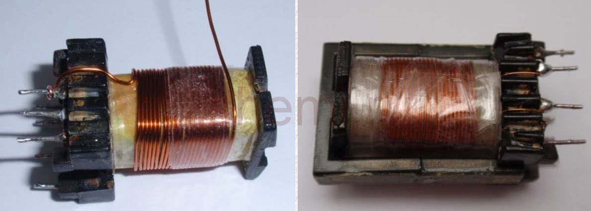 Силовой ключ выполняется первичной обмоткой высокочастотного трансформатора. Для эффективной трансформации в/ч импульсов до 100 килогерц конструкцию магнитопровода делают из альсифера или ферритов.