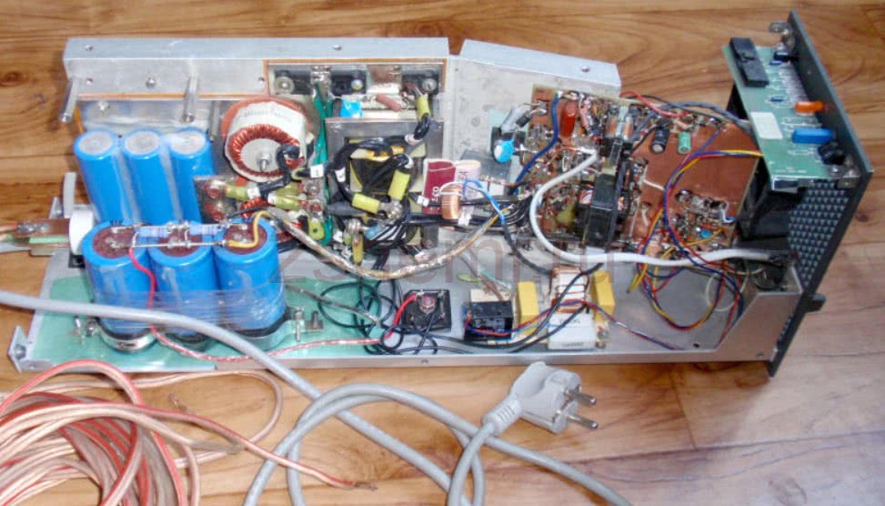 Блок выглядит менее солидно. Охлаждение намного меньше. Конденсатор в высоковольтной цепи — меньше. Трансформатор меньше. Упрощение номер 2. Экономят на выходном токе
