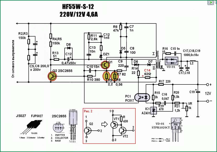 При ремонте подобных устройств их нужно подключать через лампочку (лампа накаливания 100-200 Вт, последовательно с нагрузкой), что-бы в случае КЗ в нагрузке, не вышел из строя выходной транзистор и не погорели дорожки на плате. Да и вашим домочадцам спокойнее, если вдруг внезапно не погаснет свет в квартире. Основной неисправностью является пробой Q1 (FJP5027 – 3 А ,800 В, 15 мГц) и как следствие – обрыв резисторов R9, R8 и выход из строя Q2 (2SC2655 50 В\2 А 100 мГц). На схеме они выделены цветом. Q1 можно заменить любым подходящим по току и напряжению транзистором. Я ставил BUT11, BU508. Если мощность нагрузки не будет превышать 20 Вт можно ставить даже J1003, которые можно найти на плате от перегоревшей энергосберегающей лампы. В одном блоке совсем отсутствовал VD-01 (диод шоттки STPR1020CT -140 В\2х10 А) я поставил вместо него MBR2545CT (45 В\30 А), что характерно, он вообще не греется на нагрузке 1,8 А (использовалась лампа автомобильная 21 Вт\12 В). А родной диод за минуту работы (без радиатора) разогревается так, что рукой невозможно дотронуться. Проверил потребляемый устройством (с лампой 21 Вт) ток с родным диодом и с MBR2545CT – ток (потребляемый из сети, у меня напряжение 230 В) понизился с 0,115 А до 0,11 А. Мощность снизилась на 1,15 Вт, я считаю, что именно столько рассеивалось на родном диоде. Заменить Q2 было нечем, под рукой нашелся транзистор С945. Пришлось “умощнить” его схемой с транзистором КТ837 (рис 2) . Ток остался под контролем и при сравнении тока с родной схемой на 2SC2655, получилось ещё снижение потребляемой мощности c той же нагрузкой на 1 Вт.