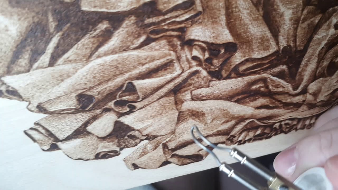 Как только изобретен был прибора для горячей гравировки (пирограф, по-другому), пирография стала развивается, как техника вполне самостоятельная и в ДПИ, и в искусстве (в частности, в графике). Еще она становится одним из популярнейших видов детского, а также самодеятельного творчества. И остается им по сегодняшний день.