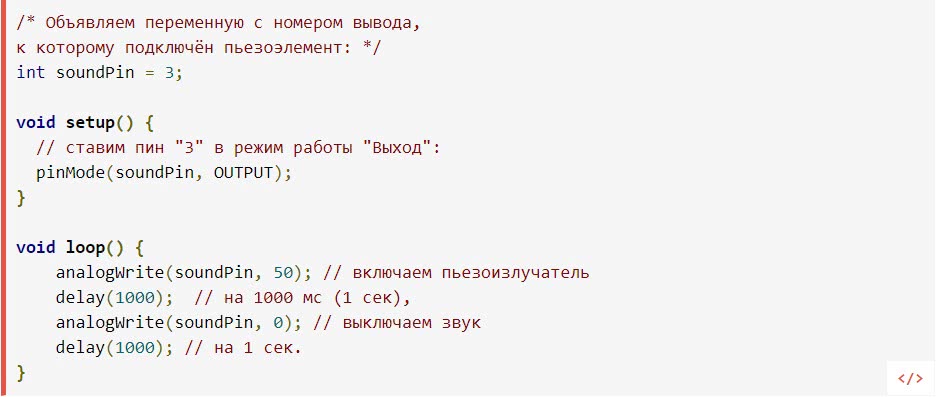 int p = 3; //объявляем переменную с номером пина, на который мы //подключили пьезоэлемент void setup() //процедура setup <pinMode(p, OUTPUT); //объявляем пин как выход > void loop() //процедура loop <tone (p, 500); //включаем на 500 Гц delay(100); //ждем 100 Мс tone(p, 1000); //включаем на 1000 Гц delay(100); //ждем 100 Мс >