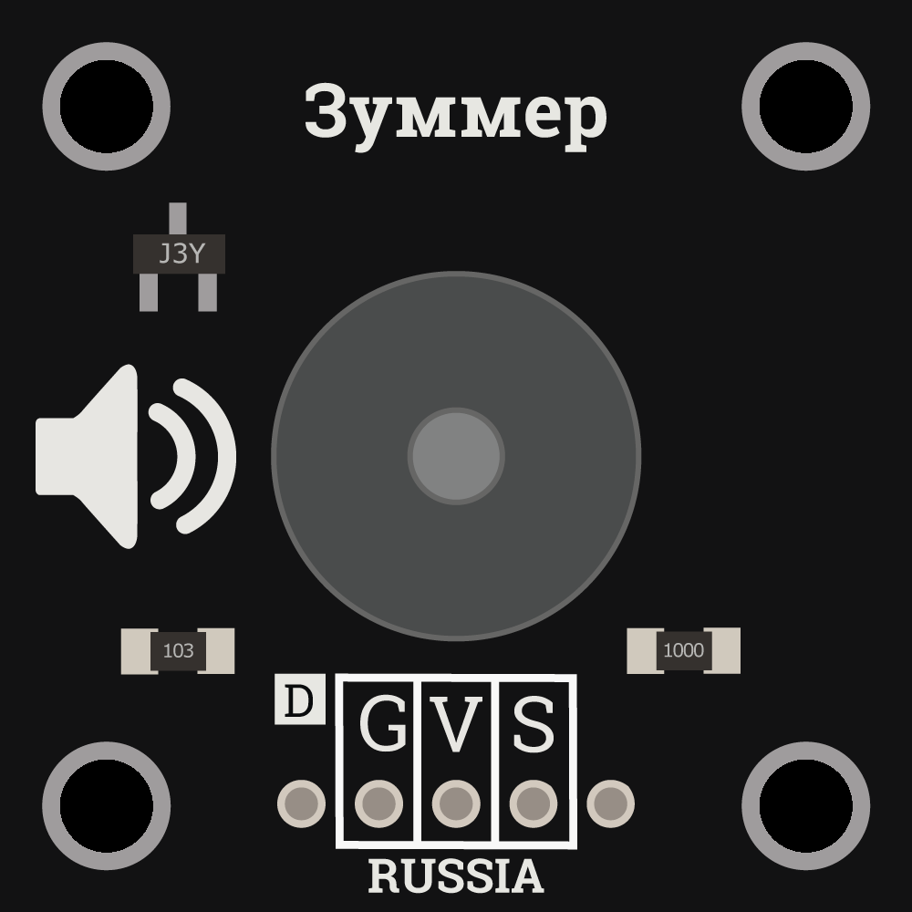 Trema-модуль зуммер активный состоит из 5В генератора прямоугольных импульсов (меандра) с частотой 2,3 кГц, и электромагнитного излучателя в одном корпусе. Сигнал с генератора подается на электромагнитный излучатель и преобразуется в звуковые волны той же частоты.