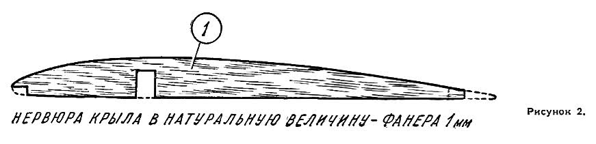 По шаблону 1 (рис. 2), вырезанному из картона, надо по возможности точнее острым ножом или лобзиком вырезать из фанеры или из картона 18 нервюр, придающих крылу определенный профиль. Для удобства все 18 заготовок лучше заранее сбить гвоздиками в стопку и выпиливать все нервюры одновременно.