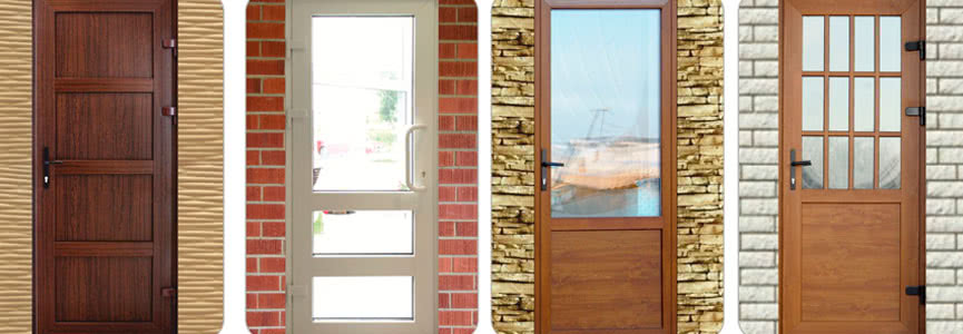 Уличные пластиковые двери могут быть как остекленными, так и без стекла. В остекленных конструкциях стекло находится чаще в верхней части полотна, но все большую популярность набирают изделия со стеклом в полный рост, которое для устойчивости конструкции разделяется пополам при помощи импоста.