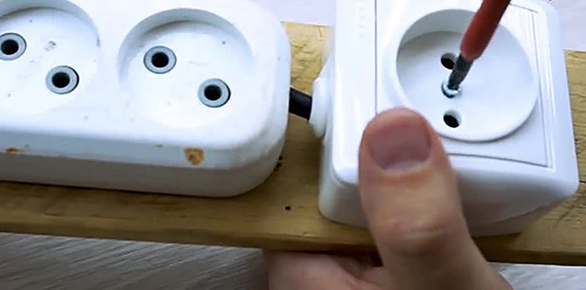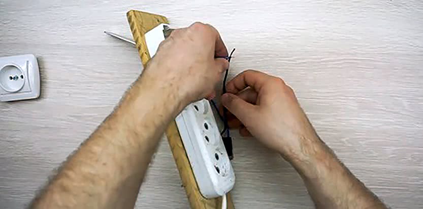 Ввел кусочек провода в корпус дополнительной наружной розетки, который прикрутил к той же дощечке. Зачистил концы провода.