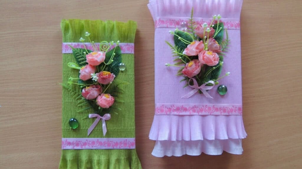 Коробочку так же можно украсить цветочками из обычной бумаги или из гофрированной (подойдет и обычная салфетка), смотрите мк: