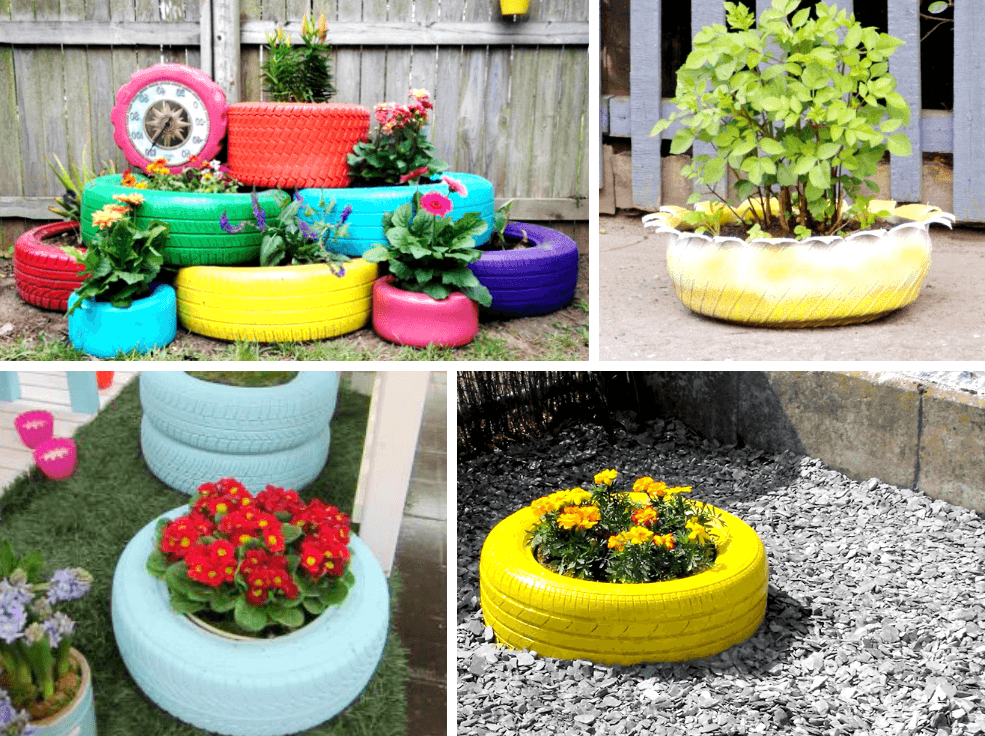 В ход идут старые автомобильные покрышки, пластиковые бутылки, пни, консервные банки и даже старая обувь. Остается лишь включить фантазию и приступать к делу.