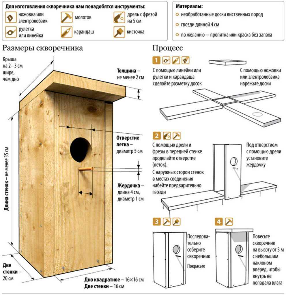 Когда решитесь собрать изделие своими руками. Обязательно найдите схему или фото сборки в интернете или книгах. Благодаря этому вы не потратите лишнее время и материалы для изготовления. Это вам сейчас кажется, что это просто, но на самом деле все сложнее. Главное верить в свои силы и не сдаваться. Однажды собрав скворечник вы легко сможете собрать еще один. Это правило относится к любым изделиям из дерева, главное не забывать технологию сборки и создания. Не бойтесь браться за сложные задумки. Вы получите большой опыт, а это очень полезно. Чтобы облегчить задачу — можно купить электрические инструменты. Но это не предаст антуража физической работы Если вы сделали скворечник, скамейку, табуретку и прочие конструкции. Найдите им применение. Отнесите скворечник в лес, прикрепите к дереву. Поставьте скамейку в гараж или на дачу. Постоянно улучшайте свою технику в этом нелегком деле