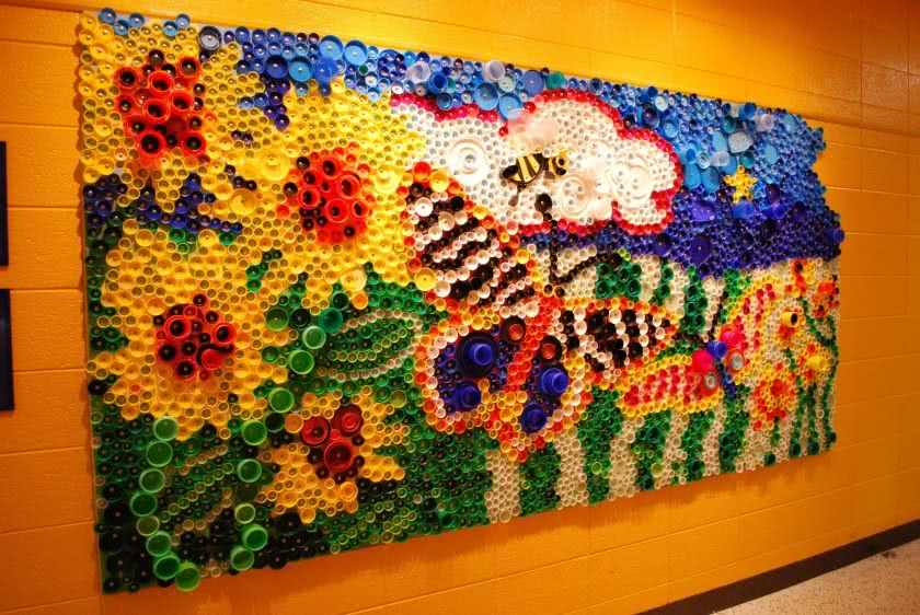 - Несколько видов крышек различного размера, что также относят к плюсам. Например, из больших крышек (от пятилитровых ёмкостей) удобно собирать панно для украшения гаражных ворот.