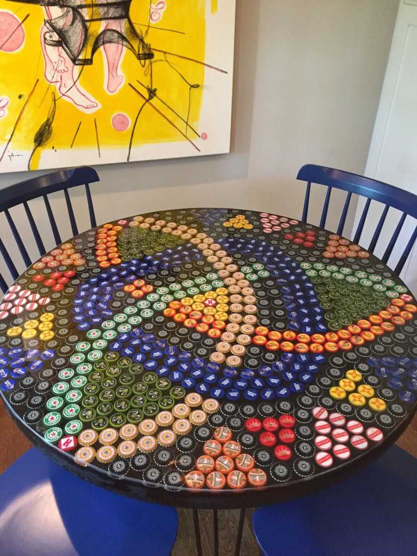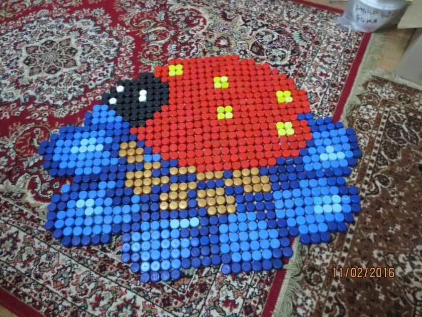 - На фото поделок из крышек можно оценить всё разнообразие красок и замысловатый рисунок, который можно создать для будущего изделия.